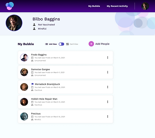 Inside the Bubbel site, you can see your profile (where you self identify your comfort levels as mindful, cautious or unconcerned and toggle your vaccination status) and your chosen “social bubble”. For each person listen in your bubble you can see how they self identify and the last time you saw them, according to your activity log.